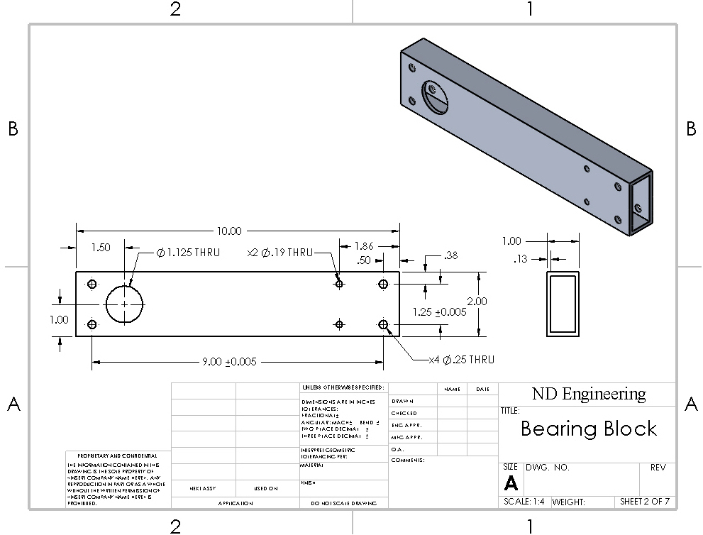 Drawing for the table mount subassembly shown on the left, and the bearing block – to support the torsional spring and main launch mechanism – on the right.