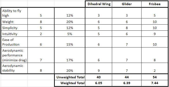 The decision matrix generated to help select the design of the aircraft. The frisbee design is the clear winner.