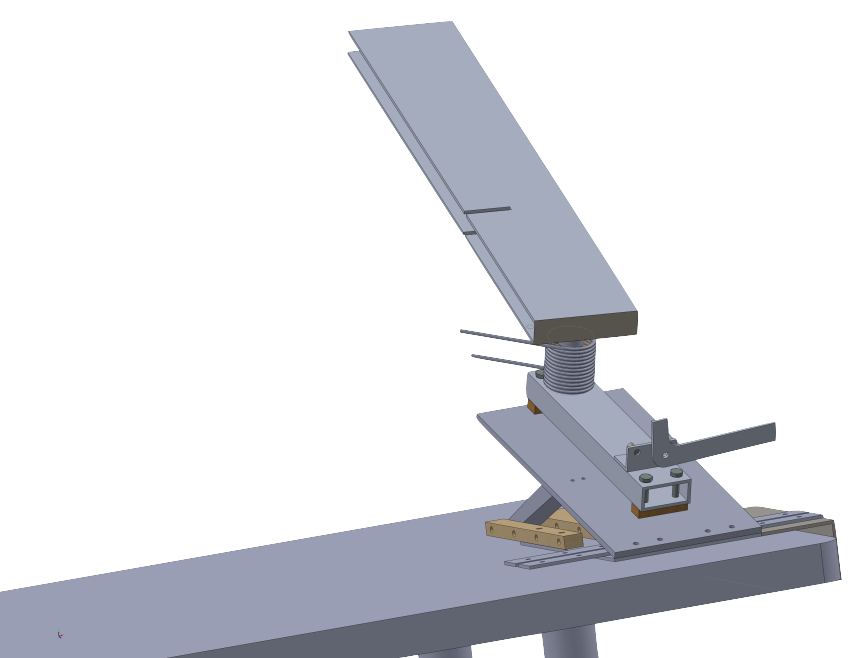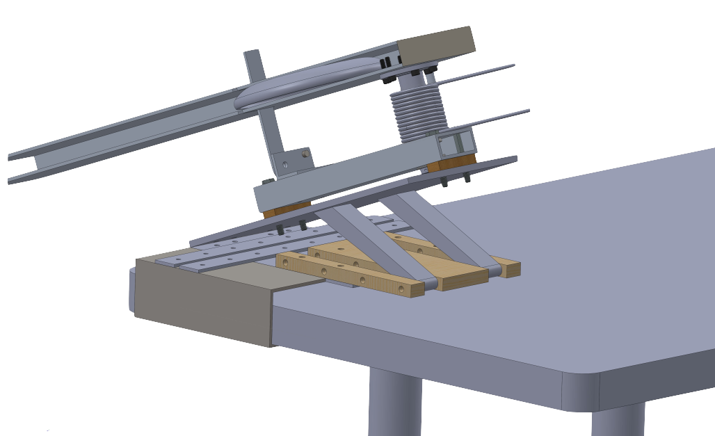 A view of the complete launcher assembly mounted to the table. The mechanism is shown in its 'loaded' configuration, with the trigger arm slotted into a groove in the launch arm.