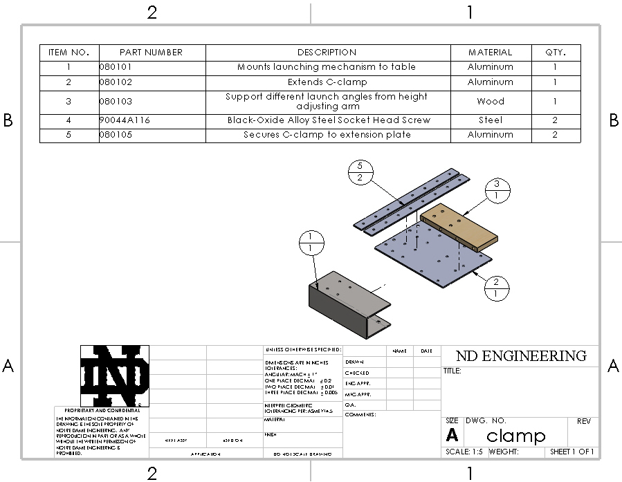 We came up with a design which we defined in four main subassemblies: the table mounting rig, the angle adjustment mechanism, the mechanical power (torque) storage & delivery unit, and the swinging arm (which holds and releases the frisbee). In total, our team modeled approximately 25 individual components for the various mechanisms and subassemblies. We made engineering drawings for each one; below are some highlights.